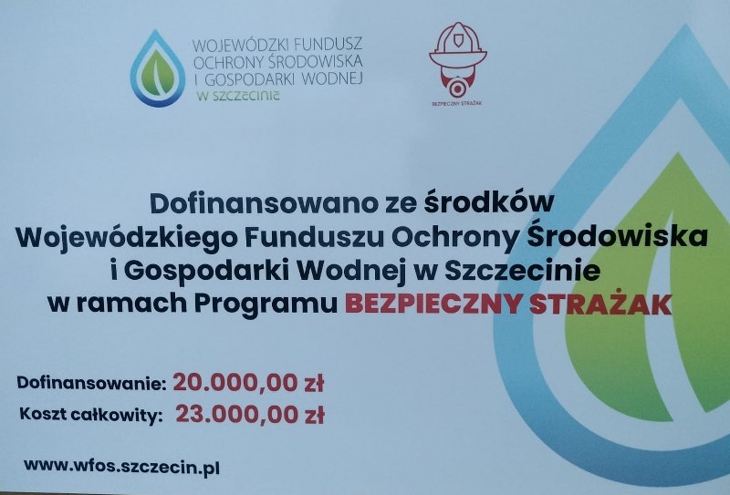 Zakup został zrealizowany dzięki dofinansowaniu z Wojewódzkiego Funduszu Ochrony Środowiska i Gospodarki Wodnej w Szczecinie w ramach programu „Bezpieczny Strażak”.